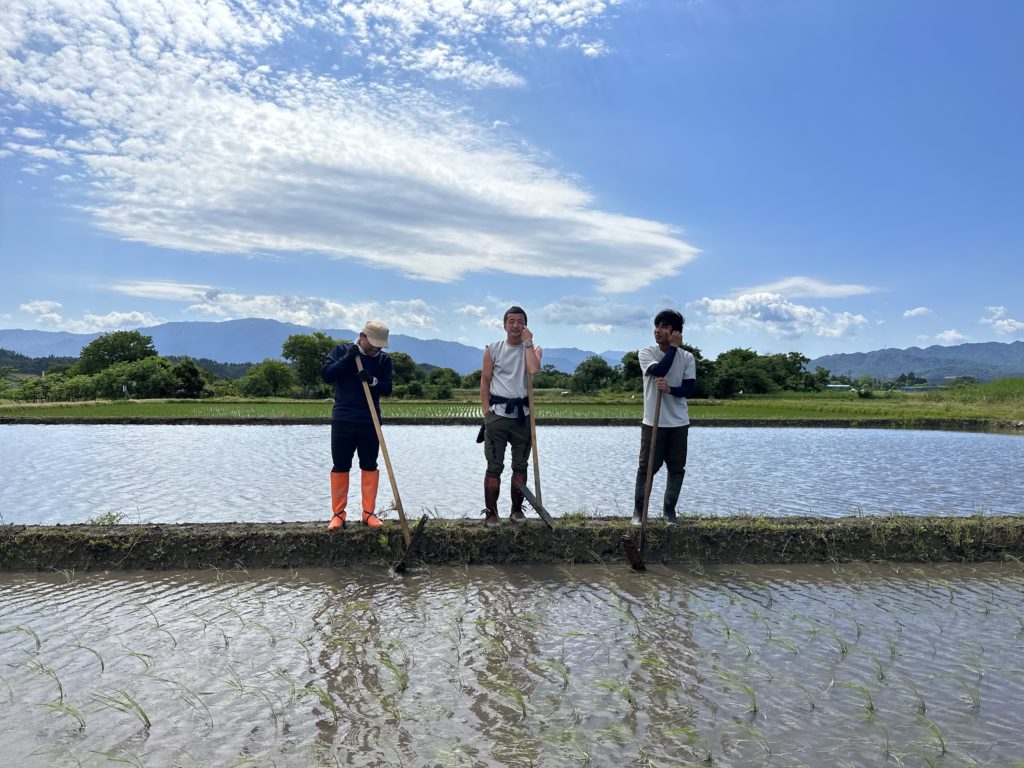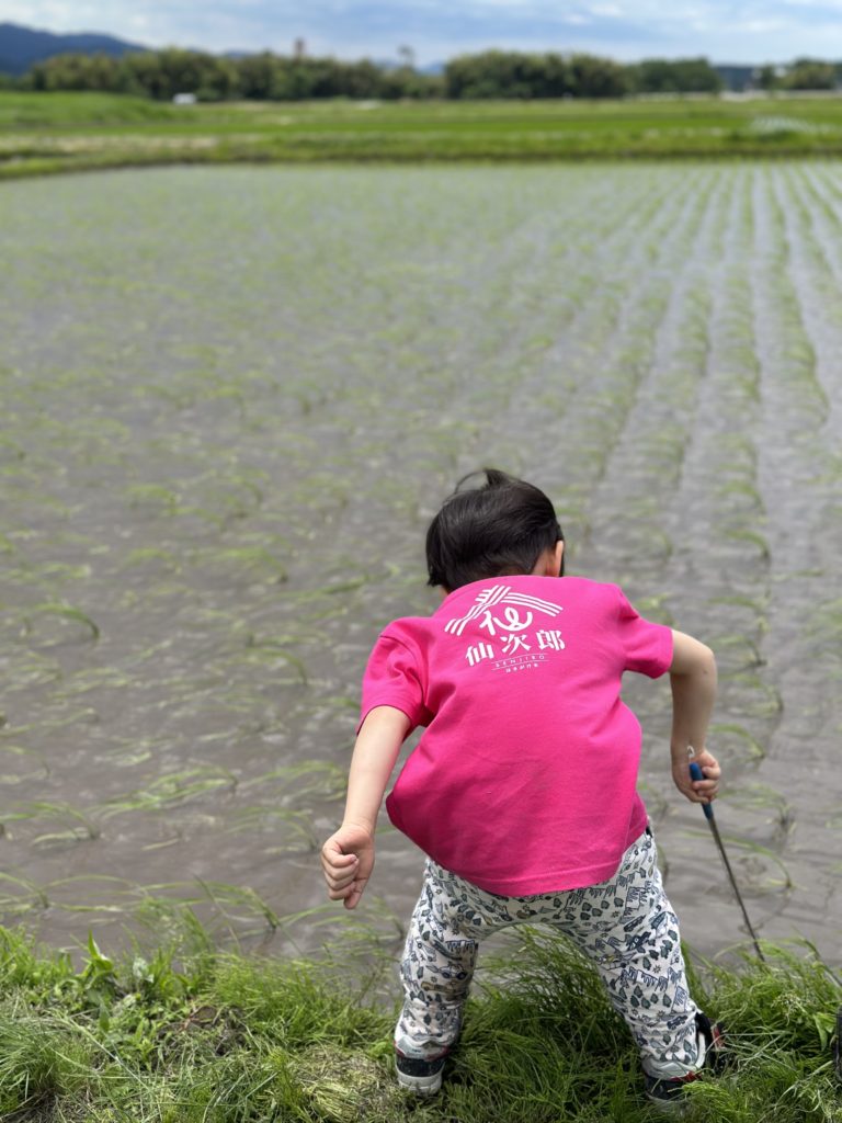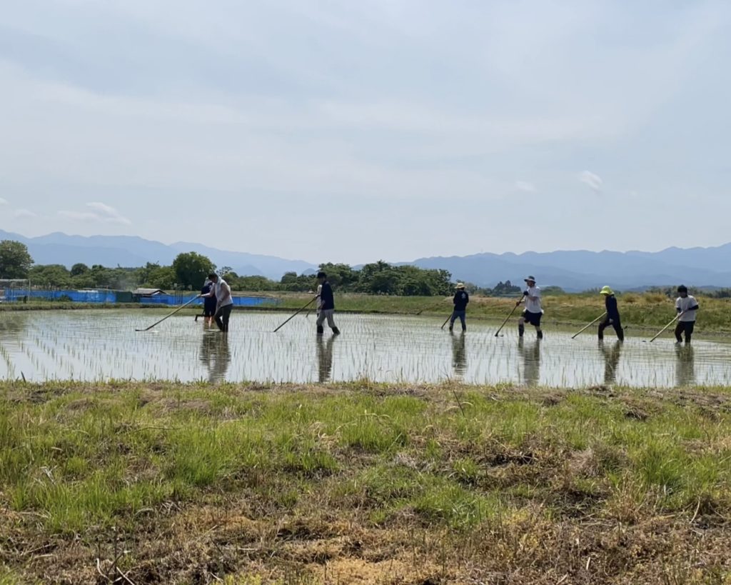 稲と稲の間を1列ずつ土を醸しながら進んで